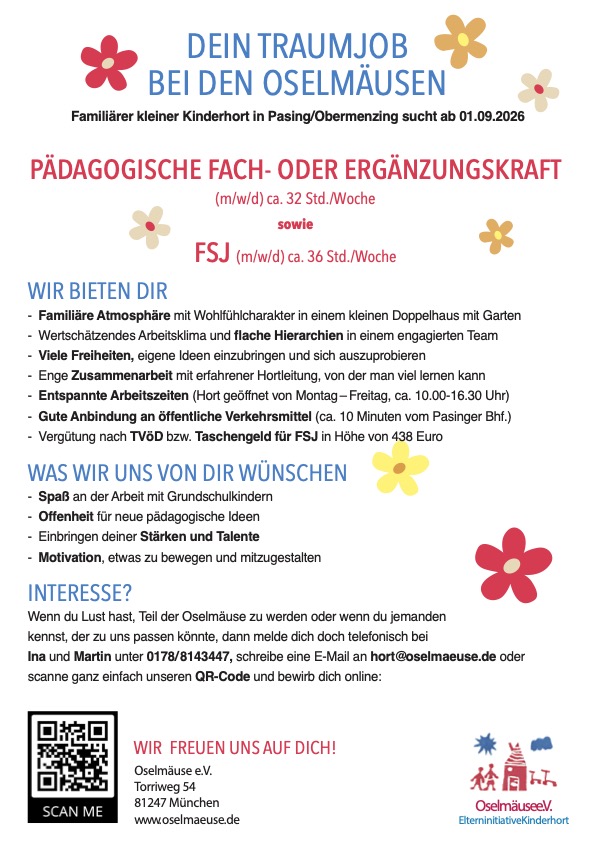 Wir sind eine private Eltern-Kind-Initiative, die einen Schulhort für Kinder der Pasinger Oselschule betreibt. Unser Hort bietet für 17 Kinder der 1. bis 4. Klasse im Alter von sechs bis zehn Jahren Platz. Zwei ausgebildete Pädagogen kümmern sich um die Kinder, die im Hort gemeinsam Mittagessen, Hausaufgaben machen, in kleinen Gruppen spielen und entspannen.